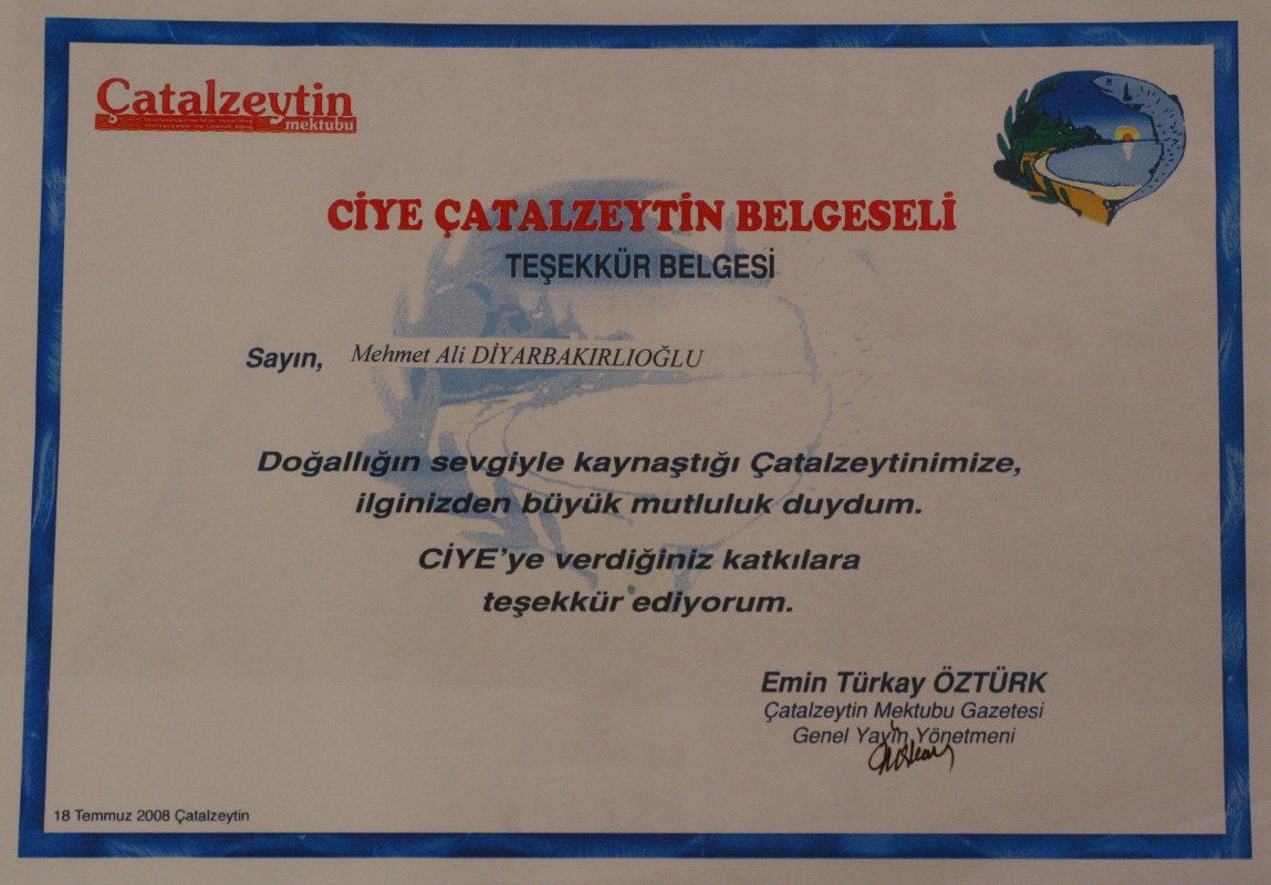 Ciye Çatalzeytin Belgeseli Teşekkür Belgesi