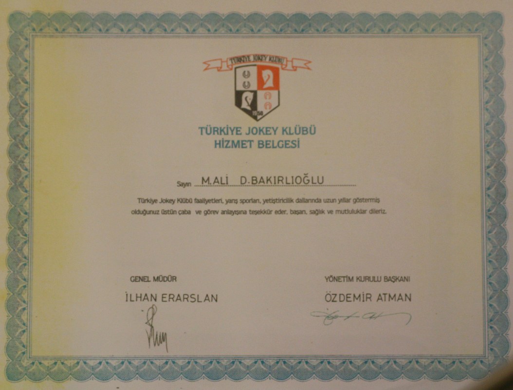 Türkiye Jokey Kulübü Başarı Belgesi
